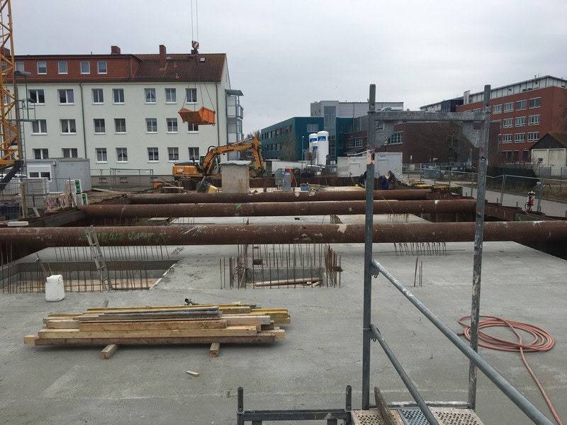 Das Gebäude erhält aufgrund der schwierigen Bodenverhältnisse in Warnemünde eine Bohrpfahlgründung mit insgesamt 83 Vollverdrängungsbohrpfählen.